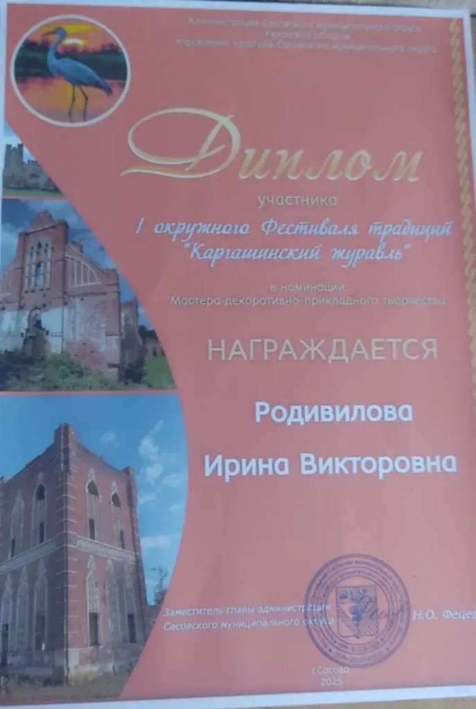 Ирина Викторовна Родивилова, мастерица и педагог центра дополнительного образования «Родина», приняла активное участие в первом фестивале народного творчества «Каргашинский журавль», прошедшем в селе Каргашино 30 августа. За своё высокое профессиональное мастерство и вклад в сохранение народных традиций своей малой родины Ирина Викторовна удостоилась заслуженного признания — ей были вручены диплом участника фестиваля и памятный сувенир.